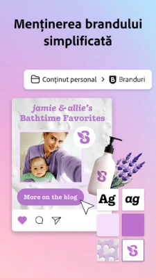 Păstrați coerența vizuală a mărcii dvs. cu o simplitate uimitoare, utilizând Kiturile de Brand din Adobe Express. Aveți la dispoziție toate fonturile, culorile și logo-urile esențiale, gata de aplicat uniform pe orice design cu o singură atingere, asigurând o prezență profesională constantă. Extindeți-vă strategia de conținut cu Planificatorul de Conținut integrat, care vă permite să planificați, să previzualizați, să programați și să publicați cu ușurință materialele pe toate canalele dvs. de pe rețelele sociale, oricând și oriunde doriți. Adobe se angajează să îmbunătățească continuu Adobe Express, adăugând noi funcționalități și extinzând compatibilitatea pe mai multe dispozitive, pentru o experiență creativă tot mai fluidă și puternică.