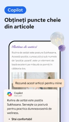 Puteți face mai mult și descoperi mai rapid cu inteligența artificială avansată, integrată direct în Microsoft Edge. Alimentat de Copilot și de modelul GPT-4 de la OpenAI, de generație următoare, browserul oferă răspunsuri complexe și rezumate detaliate ale paginilor web sau chiar ale documentelor PDF. Această capabilitate AI nu doar simplifică căutările, ci și accelerează procesul de extragere a informațiilor esențiale, prezentând rezultate concise și referințe clare. Mai mult, creativitatea dumneavoastră este amplificată: generați imagini uimitoare cu DALL-E 3 pur și simplu descriind ce aveți în minte, sau transformați schițele de text în conținut finit cu ajutorul Copilot, economisind timp prețios. Chiar și citirea devine mai accesibilă, cu funcția „Citire cu voce tare", disponibilă în diverse limbi și accente naturale.