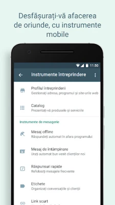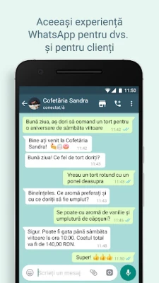 Propulsați-vă afacerea către noi orizonturi de succes. Interacționați cu clienții la un nivel mai personal, trimițându-le oferte adaptate nevoilor lor și transformând curiozitatea în vânzări concrete. Extindeți-vă vizibilitatea prin campanii publicitare inteligente, care direcționează direct către conversațiile din WhatsApp Business, facilitând achizițiile. Prezentați-vă produsele și serviciile printr-un catalog detaliat și oferiți o experiență de cumpărături fluidă, cu opțiuni de comandă și plată direct în aplicație. Flexibilitatea de a gestiona contul de pe mai multe dispozitive, inclusiv opțiunea de a transfera istoricul conversațiilor de la un cont personal, asigură o continuitate perfectă și o operare neîntreruptă a activității dvs.